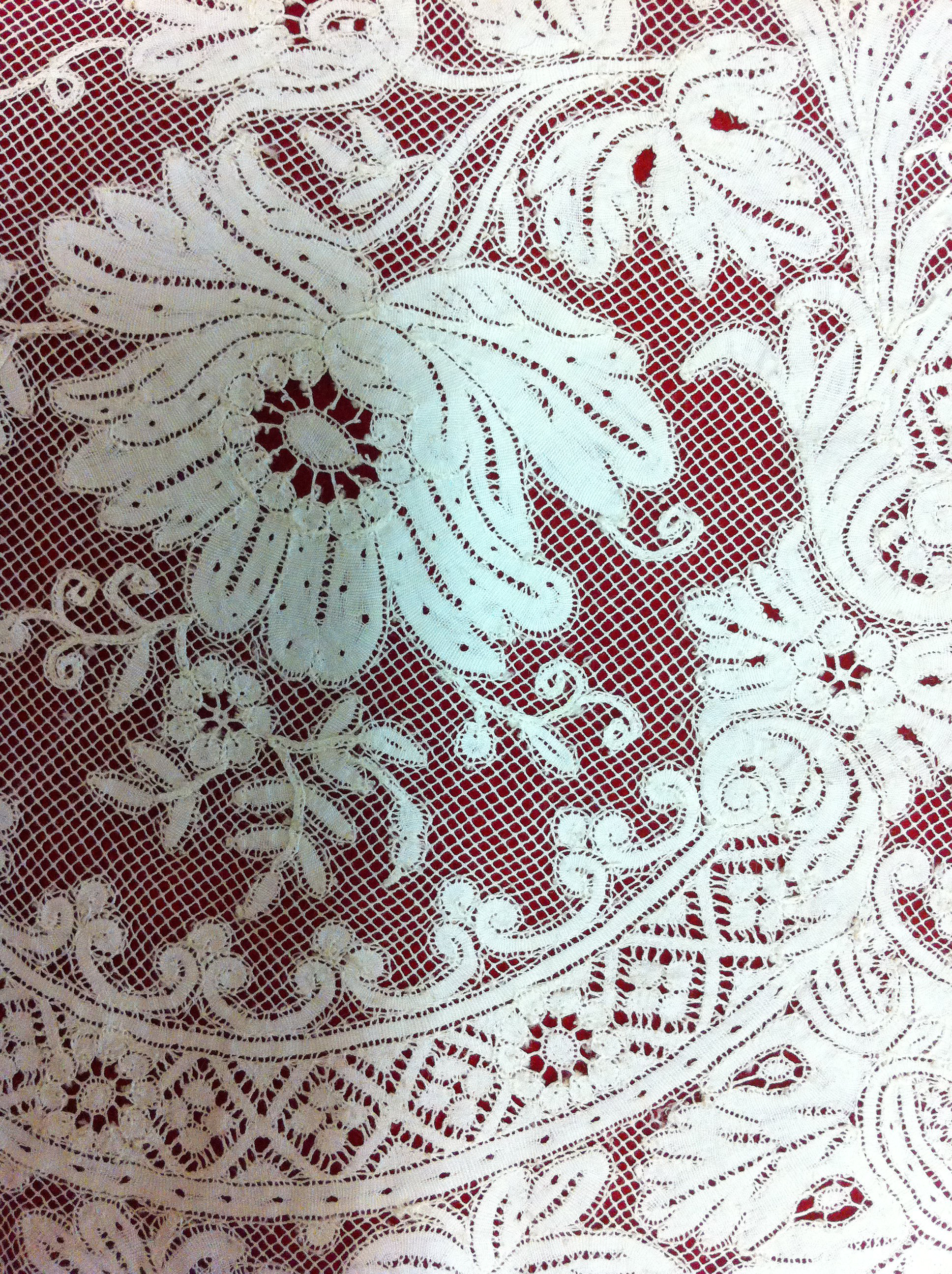 Extraordinarily beautiful and classic lace pieces contrast with the whimsical and charming, all displayed exquisitely. Who would expect a silk Maltese lace apron?
