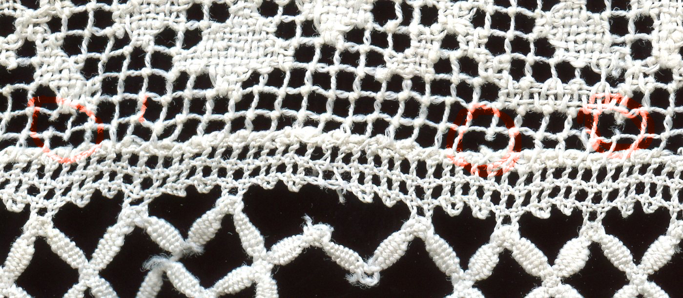 If there is a break in the threads in the tallies, they normally unravel very fast. Most of the loose tallies have not unraveled. That is a big clue that the breaks are mostly not in the tallies, but in the edge part of the lace (red). There are also some breaks where the tallies cross (green below, red above). These have to be secured with a couple of stitches to make sure they do not unravel.